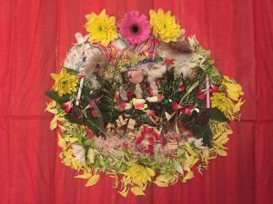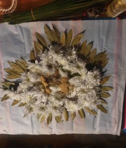 A base—usually paper or cloth—is laid out. This becomes the “field” of the offering.